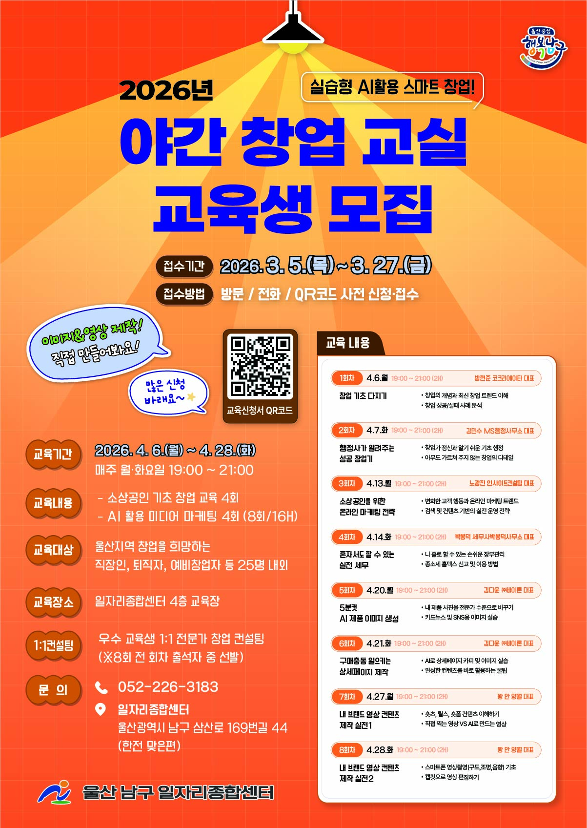 QR코드(해당포스터) / 방문접수(남구일자리종합센터3층)/ 전화 052-226-3183