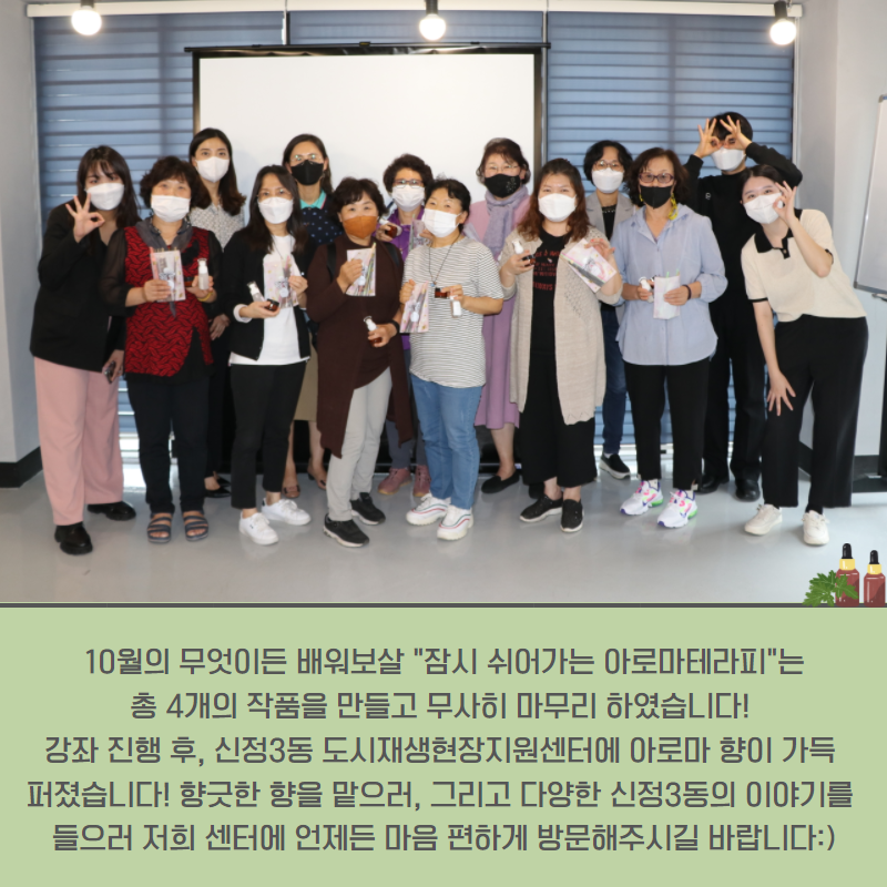 지난 9월에 이어서 10월 마을강좌 "잠시 쉬어가는 아로마 테라피" 도 주민들께서 함박 웃음과 함께 열심히 참여해주셔서 보람있게 마칠 수 있었습니다.
